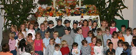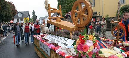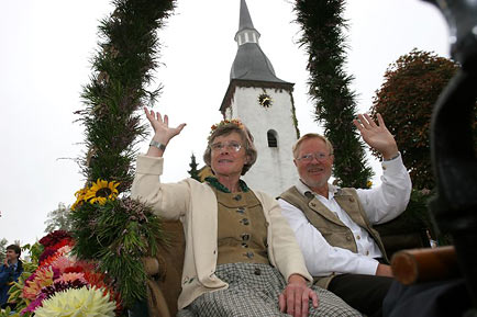 Erntedankfest 2005![]() Festveranstaltung Wie in jedem Jahr fand am 2. Wochenende im September auch in diesem Jahr wieder das traditionelle Brauchtumsfest statt. Schon wochenlang vorher hatten die Vorstandsmitglieder des Erntevereins mit den Vorbereitungen dazu begonnen. Mit Hilfe der anderen Vereine aus dem Dorf gab es dann wieder ein gelungenes, zwei Tage dauerndes Dorffest. Am Samstagabend, dem 10. September, konnte der stellvertretende Vorsitzende des Erntevereins, Fritz Ohler, zahlreiche Gäste zum 48. Erntedankfest begrüßen. Das Erntepaar des Jahres 2004, Anna und Martin Schemmel wurde verabschiedet und dem neue Erntepaar 2005 Lore und Ulrich Scheibe mit seinem "Gefolge aus dem Loopetal" wurde viel Kraft für die kommenden Aufgaben gewünscht. Ulrich Scheibe, seines Zeichens Apotheker, lies in seiner kurzen Ansprache erkennen, dass die Tradition auch von "nicht in der Landwirtschaft Tätigen" weiter geführt werden müsste. ![]() Ein buntes Programm erfreute die Besucher des Hermann-Oberth-Hauses. Das Klassik-Duo Christian Orben, Klavier, und Benjamin Müllenmeister, Querflöte, eröffneten das bunte Programm. Landrat Hagen Jobi nutzte seine Festansprache "um all denjenigen Dank zu sagen, die sich ehrenamtlich um ihre Mitmenschen bemühen, die erhebliche Opfer bringen, damit Gemeinschaft auch zukünftig eine wichtige Klammer ist." Die Pflege des Erntefestes ist in Drabenderhöhe schon zur Tradition geworden. Das Zusammenspiel zwischen Alt und Neu, zwischen den Generationen klappt unter der Regie des Erntevereines. Der Landrat dankte Karl Prawitz, der 16 Jahre den Vorsitz des Erntevereines innehatte, stellvertretend für den ganzen Verein und überreiche ihm ein Bleiglaswappen. Die Volkstanzgruppe unter der Leitung von Christa Brandsch-Böhm führte unter anderem den Bändertanz auf. Ein gelungenes Ständchen brachte das Akkordeonorchester unter der Leitung von Frau Edeltraute Gündisch-Wagner. Der Frauenchor unter der Leitung von Regine Melzer und der Männergesangverein unter dem Dirigenten Hubertus Schönauer ernteten viel Applaus. Beide Chöre durften erst nach Zugaben die Bühne verlassen. Der "Nacht-Express" spielte nach Beendigung des Programms zum Tanz auf. ![]() Erntedankgottesdienst Zum traditionellen Gottesdienst anlässlich des Erntedankfestes fanden sich auch dieses Jahr zahlreiche Besucher in der Evangelischen Kirche ein. Der Altar war bunt geschmückt mit Erntefrüchten, die eine Gabe der Kinder des Evangelischen Kindergartens waren. Zusammen mit den Erzieherinnen gestalteten die Kinder auch in diesem Jahr den Gottesdienst mit. Im Mittelpunkt stand das von den Vorschulkindern gespielte Mäusespiel "Frederick", ein Stück nach der gleichnamigen Geschichte von Leo Lionni. Im Herbst beginnen alle Mäuse Vorräte für den Winter zu sammeln. Nur Frederick scheint die ganze Zeit über nichts zu tun. Was man auf den ersten Blick nicht sehen kann: Frederick sammelt seine eigenen, ganz besonderen Vorräte. Er sammelt Sonnenstrahlen für die kalten, dunklen Wintertage, Farben gegen das Grau des Winters und Wörter für die vielen langen Wintertage. Diese Vorräte holt er dann hervor, als den Mäusen die Nahrung ausgeht, ihnen kalt wird und sie nicht mehr miteinander reden. Er holt ihnen die Erinnerung an die bunten Farben zurück, wärmt sie mit seiner Beschreibung der Sonnenstrahlen und zeigt, dass nicht nur äußere Dinge wichtig sind. Was Frederick gesammelt hat, macht nicht wirklich satt, kann aber eine große Freude sein für die Tage im Leben, an denen nicht alles so läuft wie man es sich wünscht. ![]() Festumzug Wie abwechslungsreich sich der Sommer in den letzten drei Jahren präsentiert hat, kann man gut an den Themen der Erntewagen ablesen. Wurde 2003 noch der heiße Sommer thematisiert, 2004 dann die Wespenplage, so lautete beispielsweise dieses Jahr das Motto des Erntewagens der Ortsgemeinschaft Scheidt: "War das Wetter auch nicht toll, haben wir die Karre trotzdem voll." Auch am Sonntag war das Wetter alles andere als toll, es regnete unentwegt, was dann auch zur Folge hatte, dass diesmal weniger Besucher den Erntezug bestaunten. Doch hörten die Regenfälle glücklicherweise genau in dem Moment auf, als sich der Erntezug mit seinen acht Wagen und zahlreichen Fußgruppen in Bewegung setzte. ![]() Rund 160 Kindergartenkinder wanderten mit ihren Eltern im Zug mit. Während die Kleinen aus dem Evangelischen Kindergarten als Mäuse verkleidet an das Mäusespiel "Frederick" erinnerten, zeigte der Adele-Zay-Kindergarten den Weg vom Korn zum Brot. |