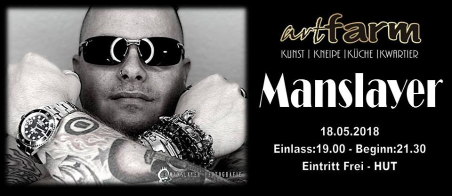 Am 18. Mai 2018 ist der Liedermacher „Manslayer“ in der Artfarm Drabenderhöhe zu Gast. Einlass ist um 19:00 Uhr, Beginn um 21:30 Uhr. Der Eintritt ist frei.