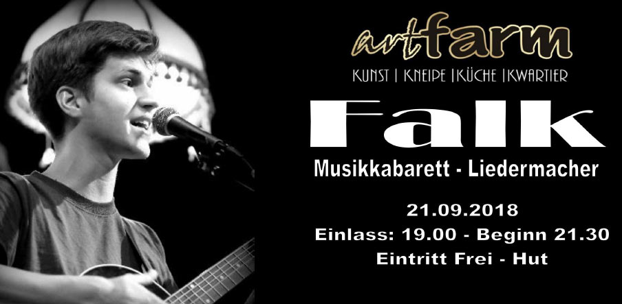 Am Freitag, 21. September 2018, ist der Liedermacher und Musikkabarettist Falk in der Artfarm Drabenderhöhe zu Gast. Einlass ist um 19:00 Uhr, Beginn um 21:30 Uhr. Der Eintritt ist frei.