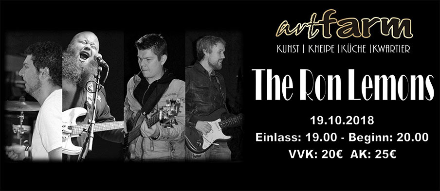 Am 19. Oktober 2018 sind „The Ron Lemons“ mit Andreas Kümmert in der Artfarm Drabenderhöhe zu Gast. Einlass ist um 19:00 Uhr, Beginn um 20:00 Uhr. Karten kosten im Vorverkauf 20 Euro und an der Abendkasse 25 Euro.