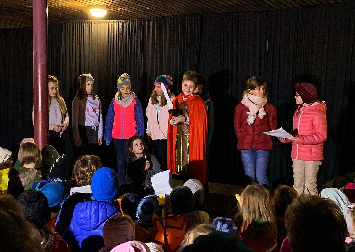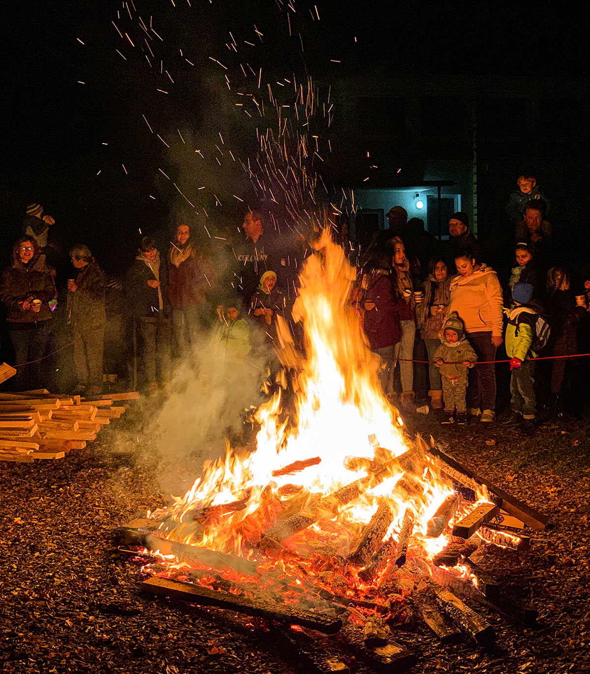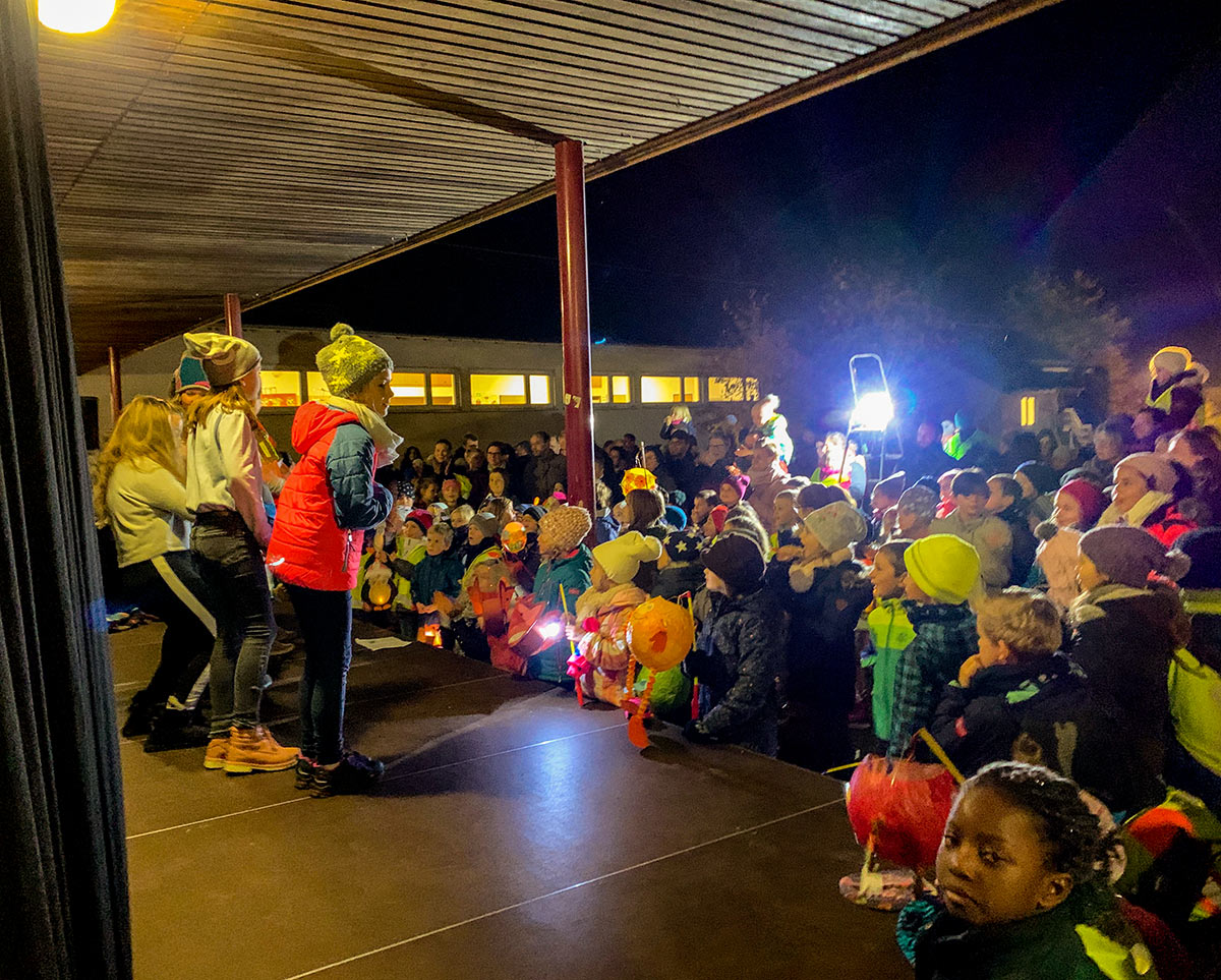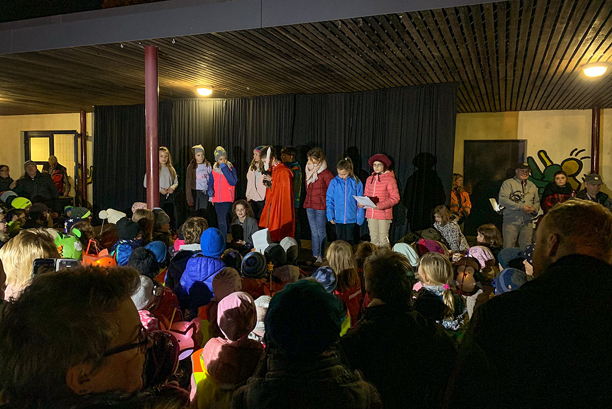 Auf dem Schulhof der Grundschule erwartete die Teilnehmer des Martinzuges ein Martinsfeuer, eine Theateraufführung, Weckmänner für die Kinder und Glühwein für die Erwachsenen.