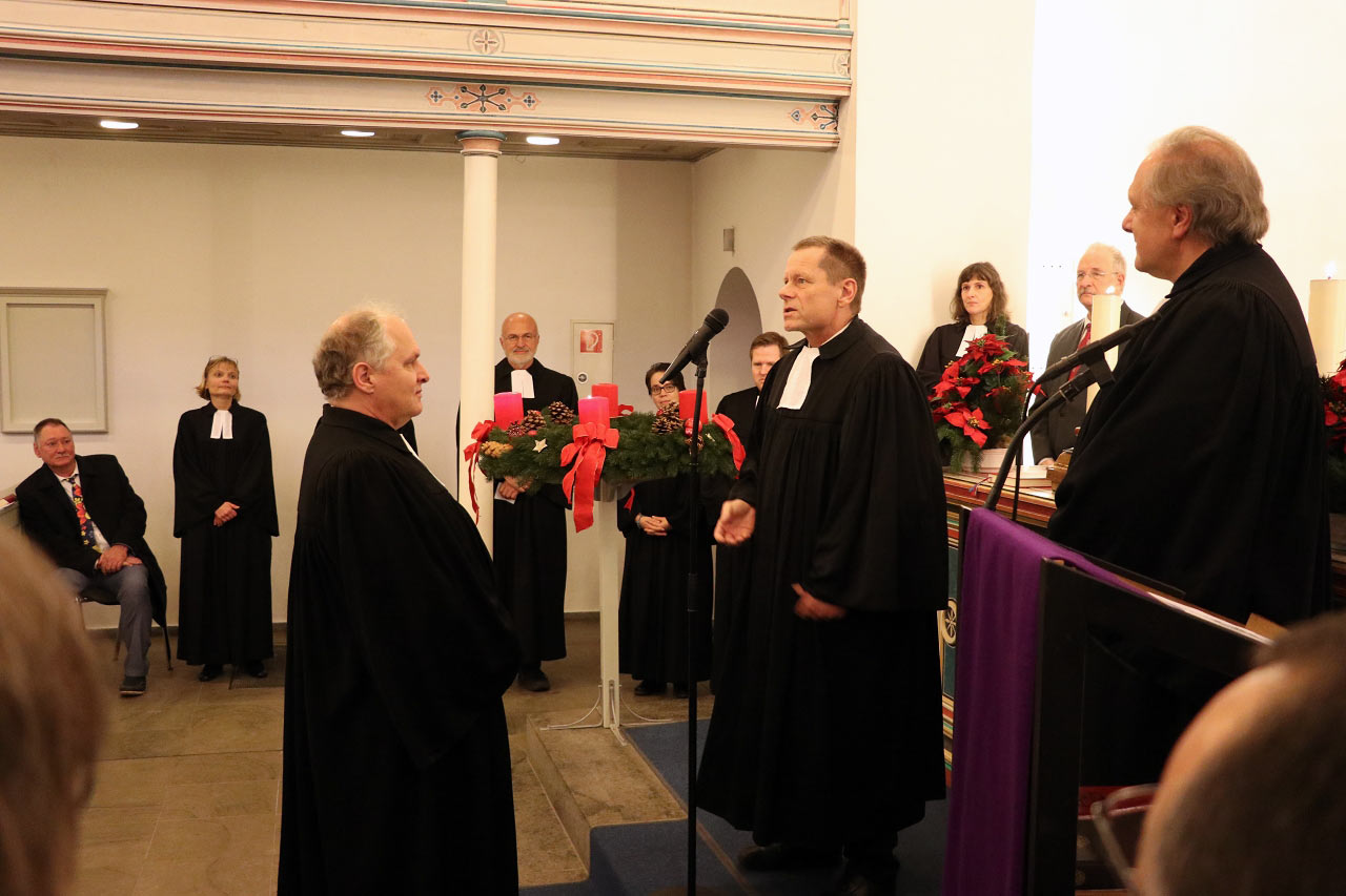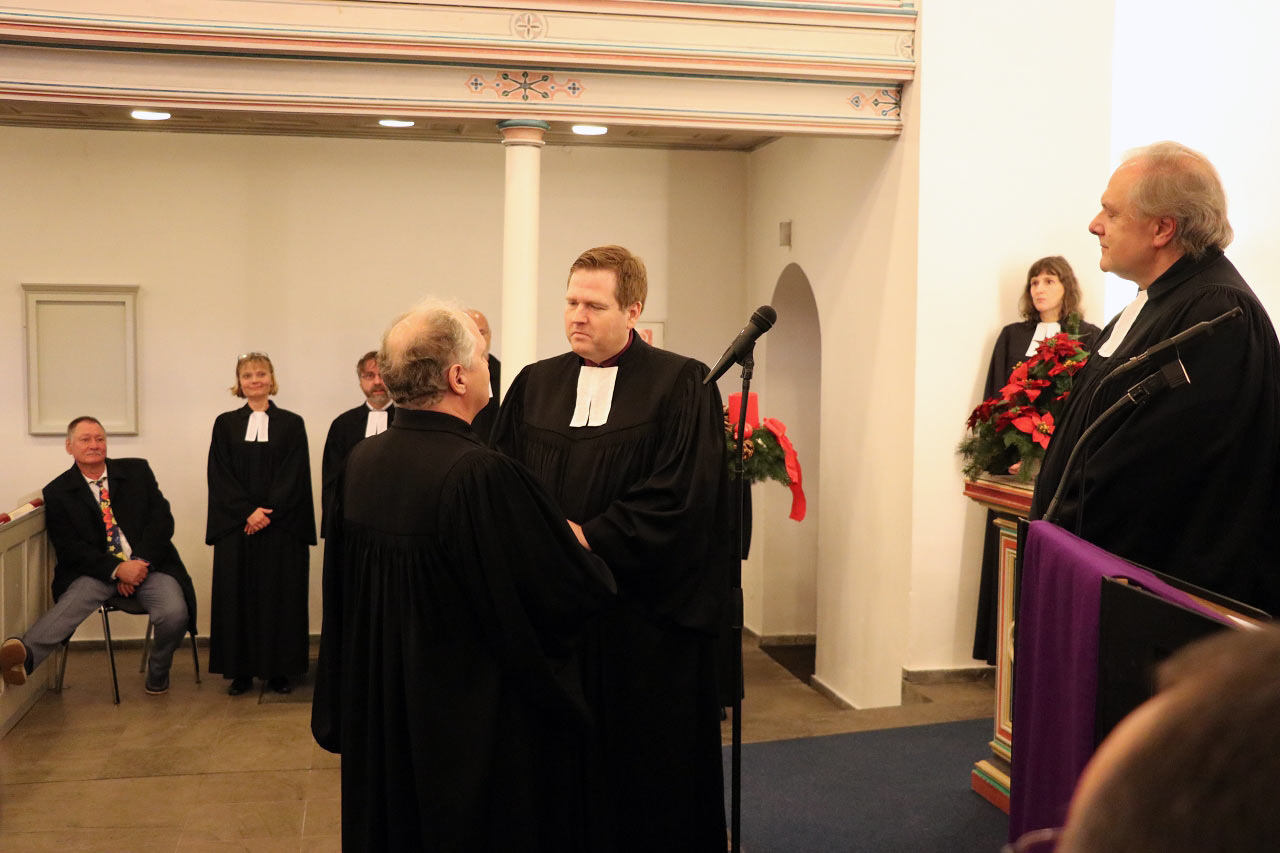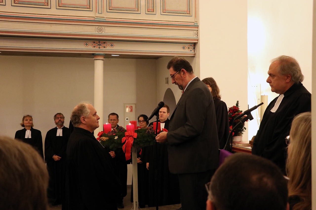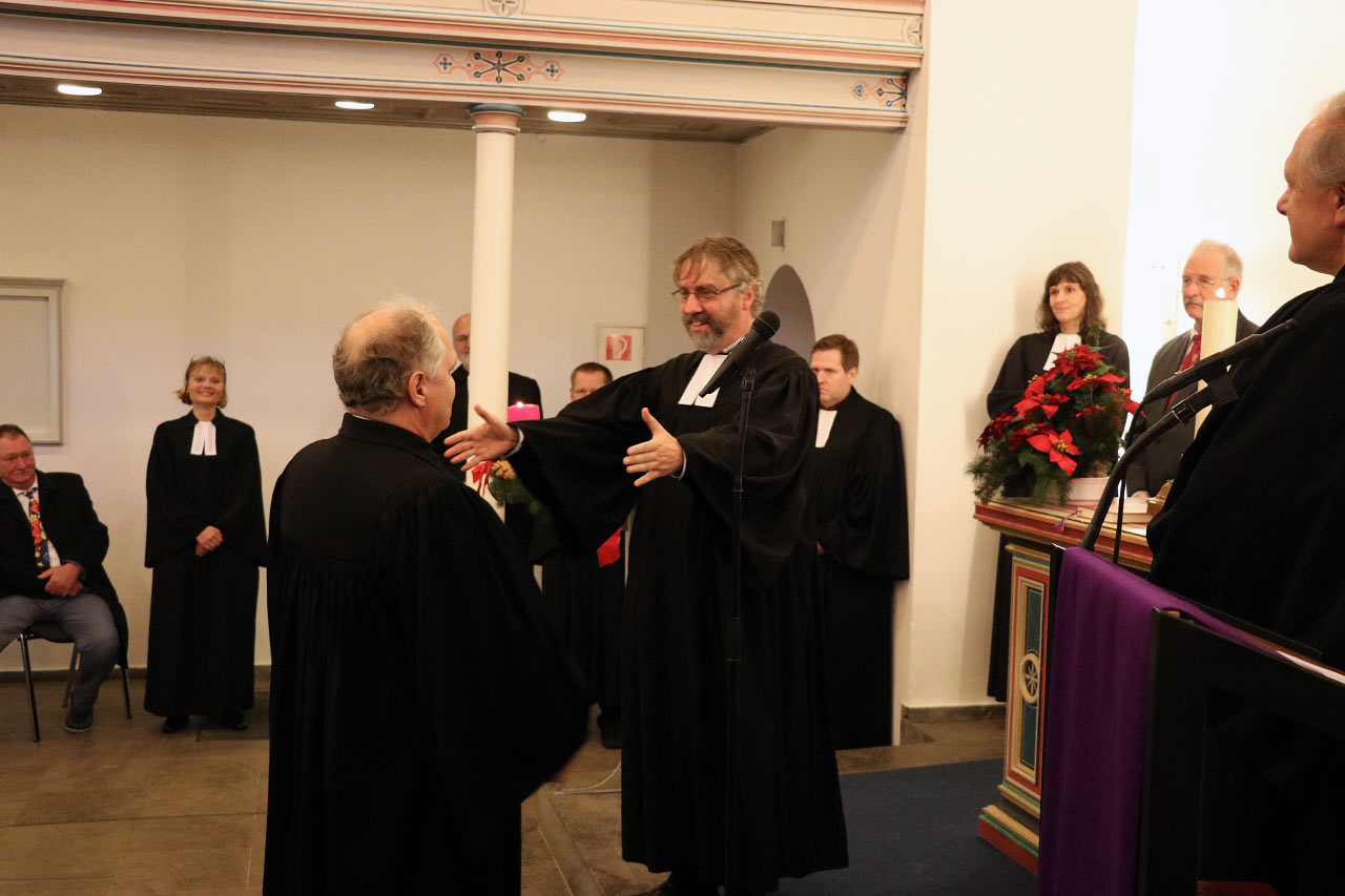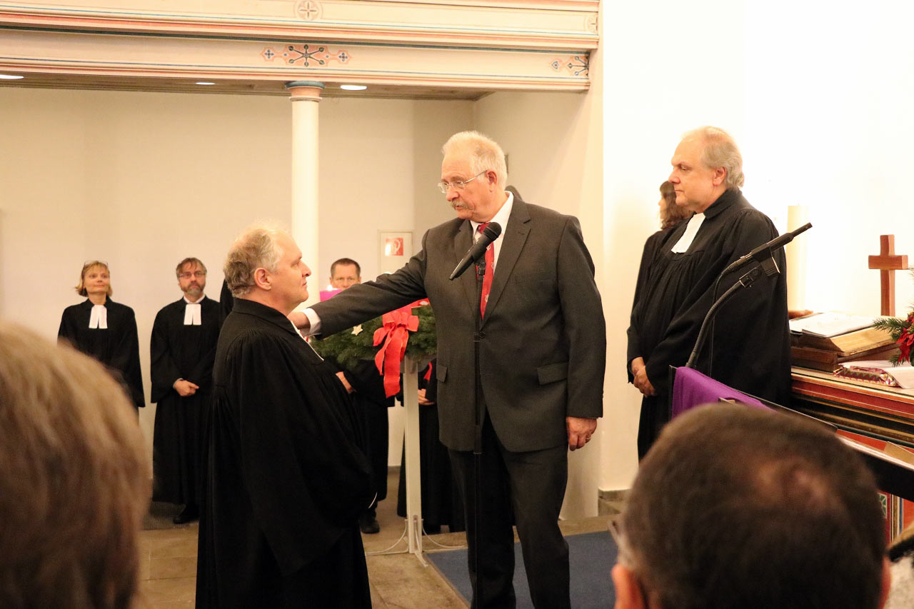 Superintendent Jürgen Knabe bat in seiner Einführungsansprache darum, den neuen Pfarrer freundlich aufzunehmen, auch unter den geänderten Bedingungen in der Gemeinde. Nach den Verabschiedungen von Pfarrer Kapff im Juli und von Pfarrer Frank Müllenmeister, der eine 50-Prozent-Stelle besetzte, im Januar, hat die Gemeinde jetzt nicht mehr anderthalb Pfarrstellen, sondern nur noch eine ganze Pfarrstelle für die Gemeinde mit 3400 Gemeindegliedern.