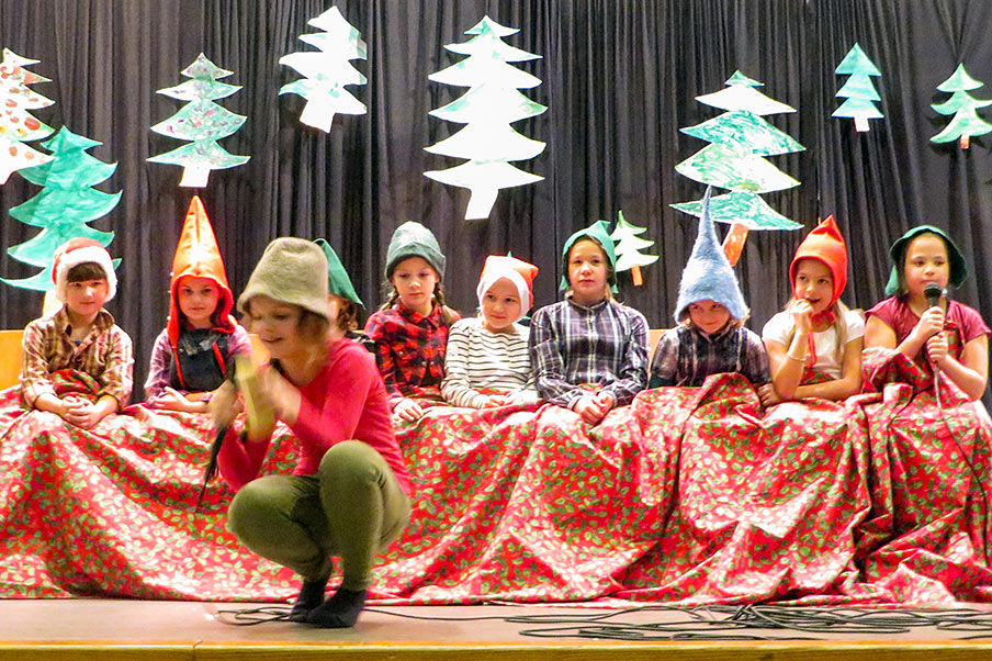 „Es war einmal ein Weihnachtsmann, der lebte mit seiner Frau und den Weihnachtswichteln im Wald“, so begann das kleine Weihnachtsmärchen, das die Theatergruppe der Grundschule unter Leitung von Ingrid Melzer aufführte. Die Wichtel hatten eine Decke vergessen und der kleinste Wichtel sollte ihnen nachlaufen und die Decke bringen, weil er „klein, flink und schlau ist“. Auf seinem Weg traf der kleine Wichtel Rotkäppchen und die sieben Zwerge, Rumpelstilzchen, den Froschkönig, die Prinzessin und andere Märchenfiguren. Ihnen allen war kalt und der kleine Zwerg nahm sie unter seine große Decke, schenkte ihnen Wärme und Geborgenheit.