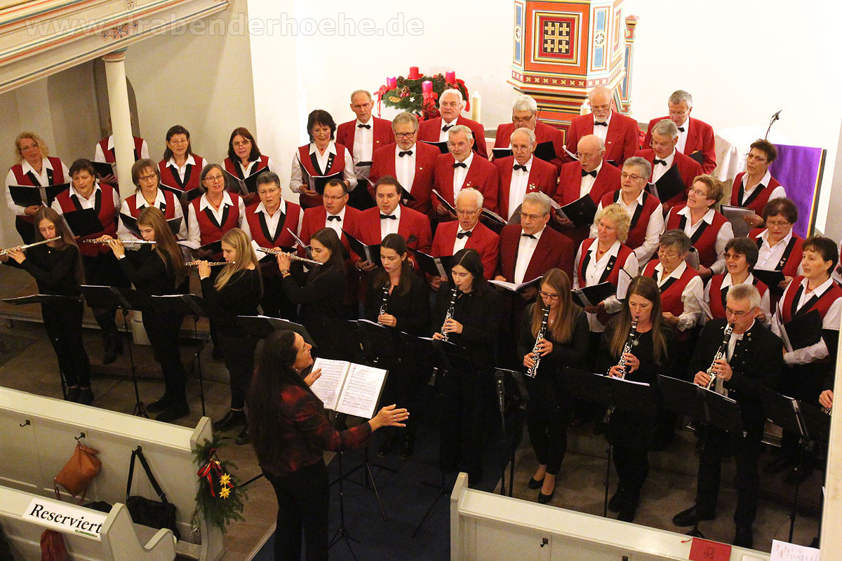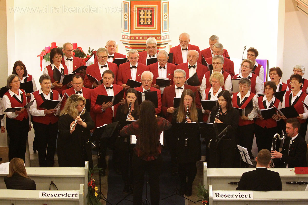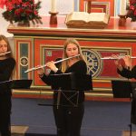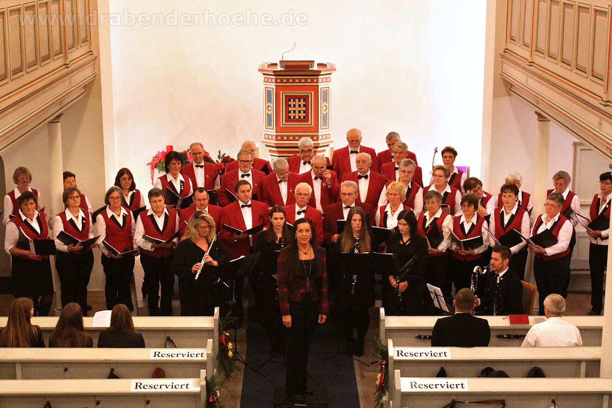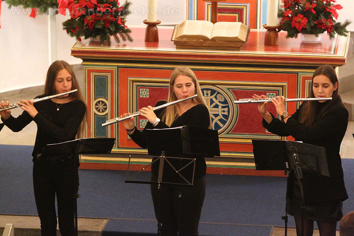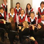 Als Regine Melzer den Taktstock in die Hand nahm, standen die Sänger und Sängerinnen vor dem Altar, stimmten kraftvoll das Lied „Macht hoch die Tür“ an, das von Michael Schumachers für Chor und Bläser arrangiert wurde. Querflöten und Klarinetten standen ebenfalls im Kirchenraum, der Rest des Ensembles spielte auf der Empore. Mit „Leise rieselt der Schnee“, eines der beliebtesten deutschsprachigen Weihnachtslieder von Pfarrer Eduard Ebel, das von Regine Melzer arrangiert wurde, wurden die Besucher weiter auf das Fest des Friedens eingestimmt. Woher die Melodie stammt ist bis heute unbekannt, aber es vermittelt allen „Freue dich, Christkind kommt bald“.