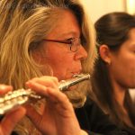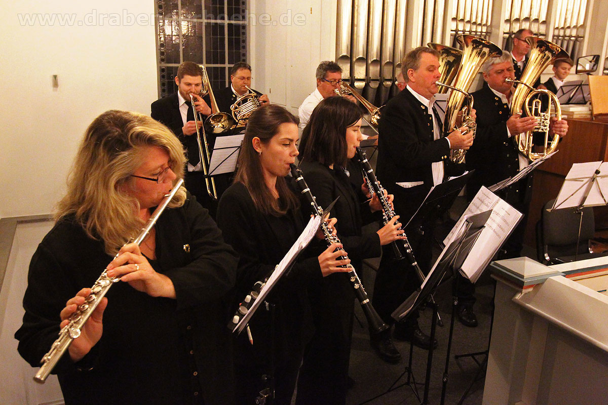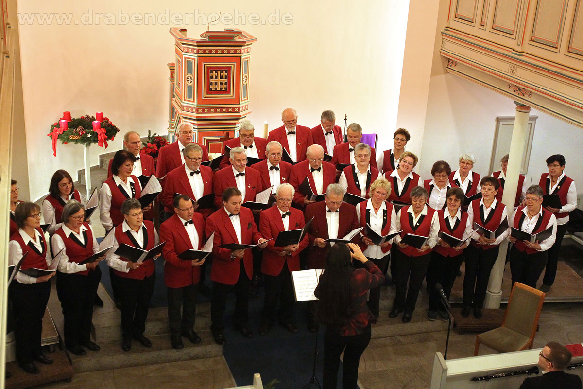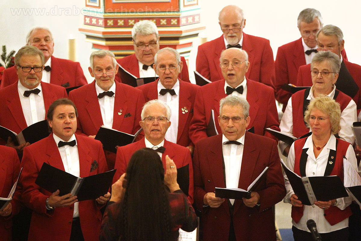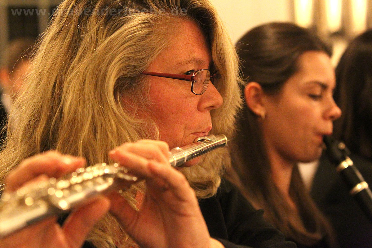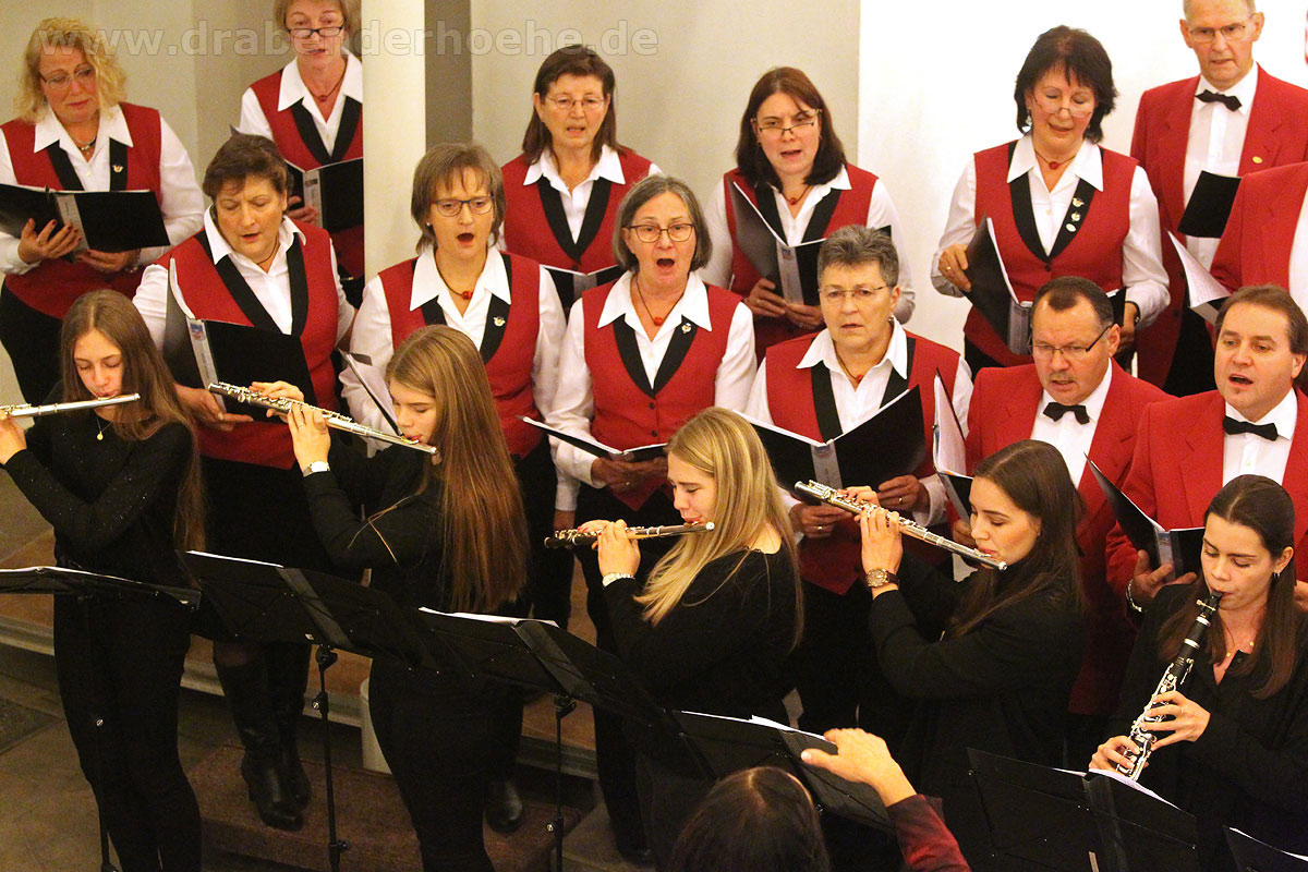 Als Regine Melzer den Taktstock in die Hand nahm, standen die Sänger und Sängerinnen vor dem Altar, stimmten kraftvoll das Lied „Macht hoch die Tür“ an, das von Michael Schumachers für Chor und Bläser arrangiert wurde. Querflöten und Klarinetten standen ebenfalls im Kirchenraum, der Rest des Ensembles spielte auf der Empore. Mit „Leise rieselt der Schnee“, eines der beliebtesten deutschsprachigen Weihnachtslieder von Pfarrer Eduard Ebel, das von Regine Melzer arrangiert wurde, wurden die Besucher weiter auf das Fest des Friedens eingestimmt. Woher die Melodie stammt ist bis heute unbekannt, aber es vermittelt allen „Freue dich, Christkind kommt bald“.