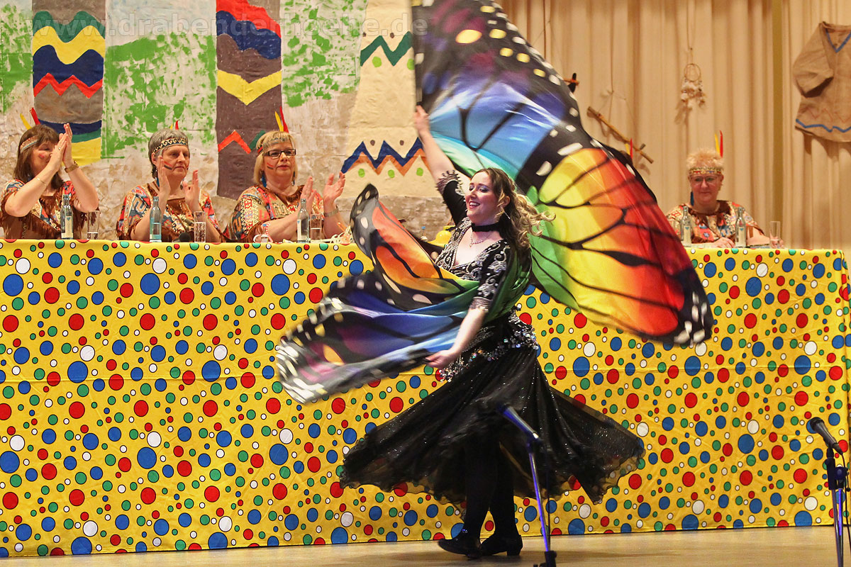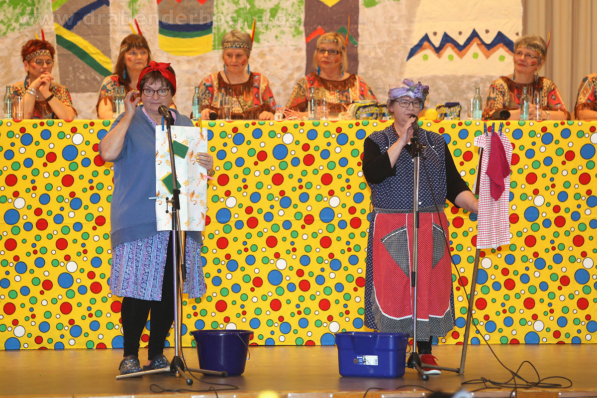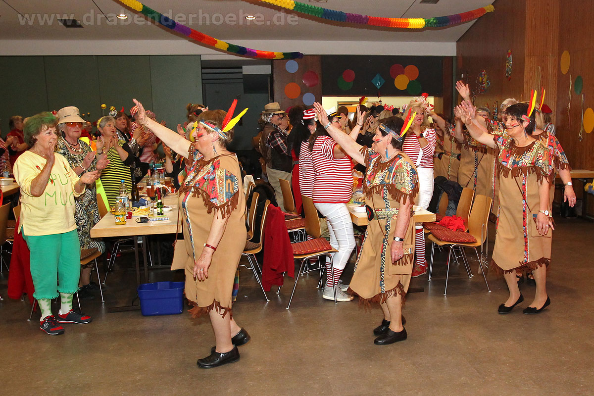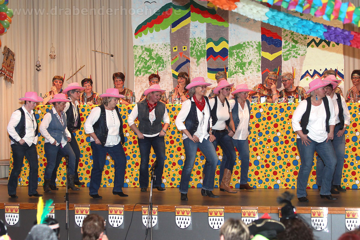 Die jecken Drabenderhöher Wiever vergaßen die Zeit und tauchten beim Lachen, Tanzen, Schunkeln und Singen an Weiberfastnacht am 28. Februar 2019 mit dem Frauenverein in die Tiefen des Karnevals ab. Gleich zu Beginn, als die Mädel des Elferrats in Indianerkostümen zu kölschen Tönen die Bühne mit schmissigen Tänzen enterten, riss es die bunt kostümierten Närrinnen von den Stühlen.