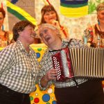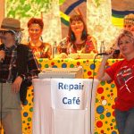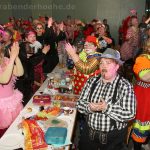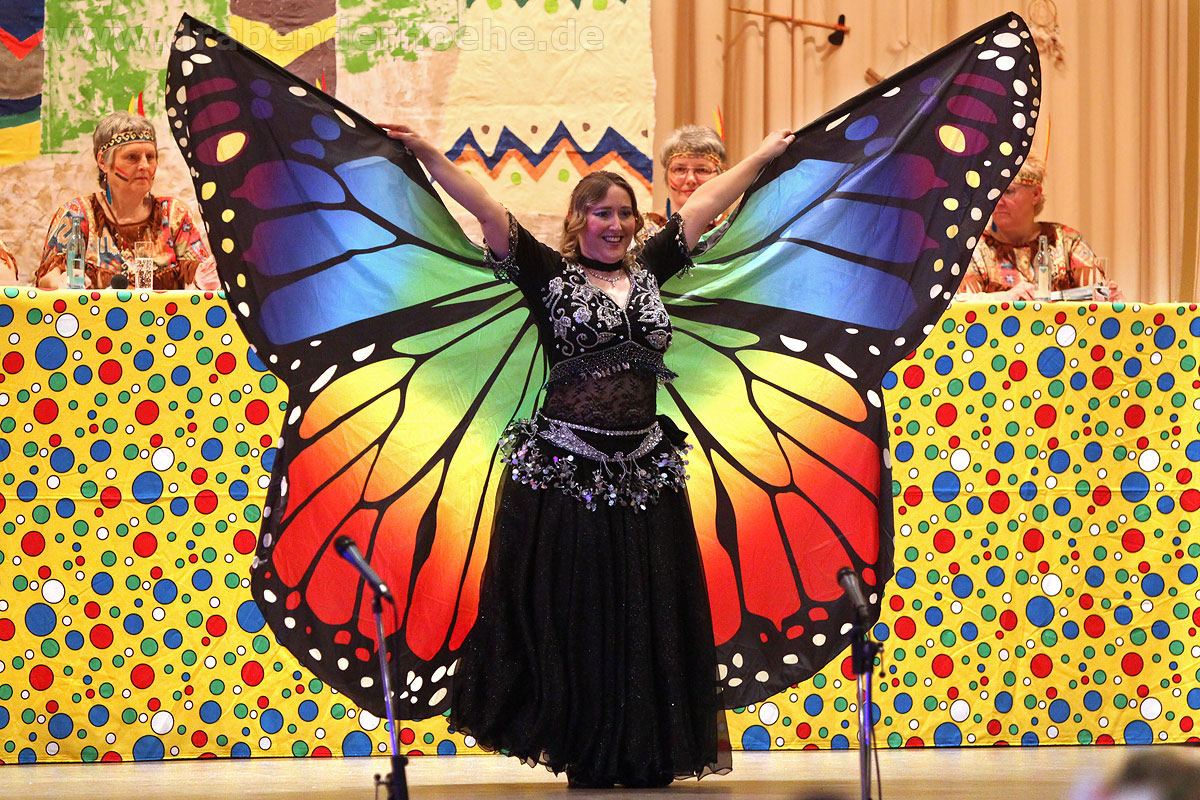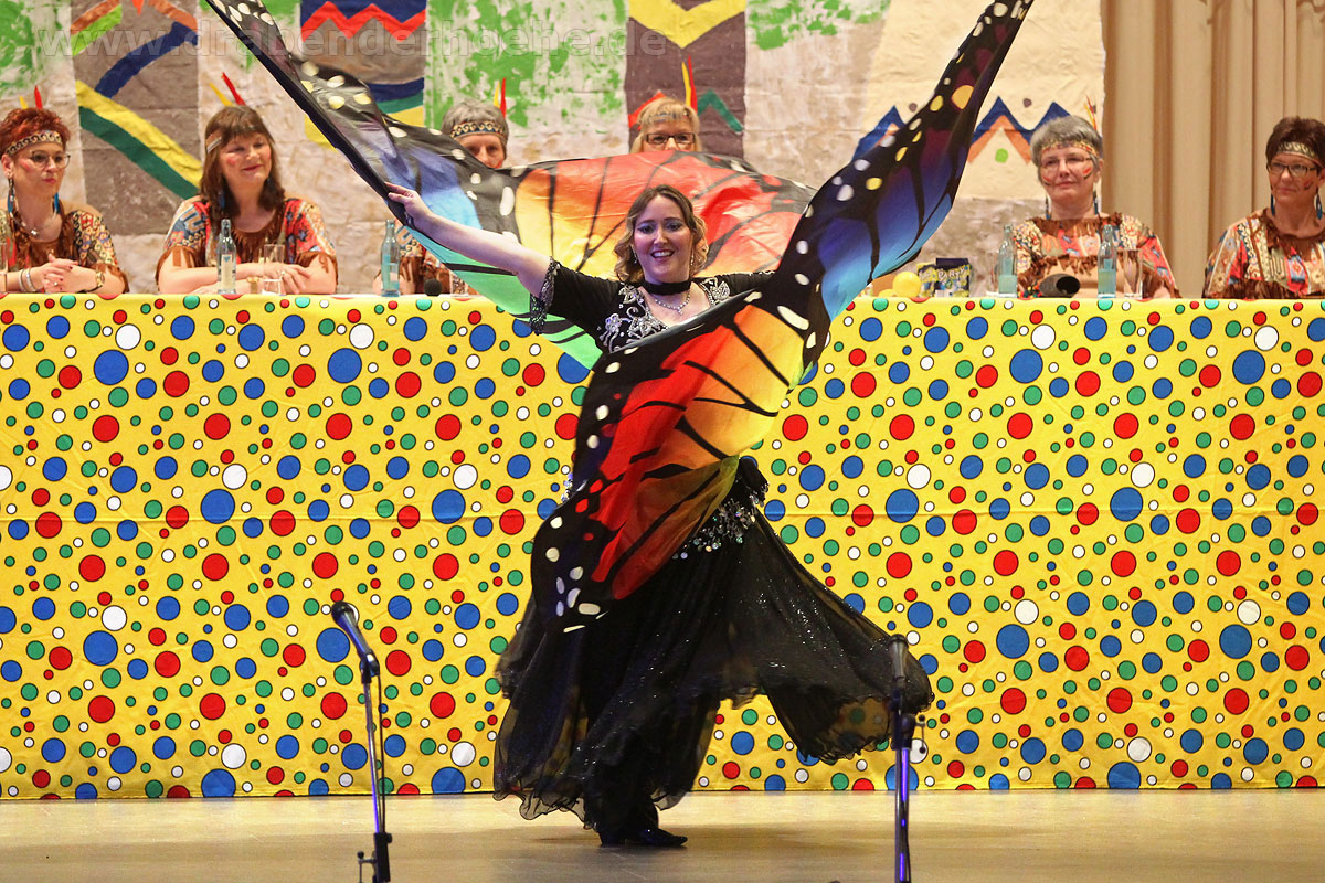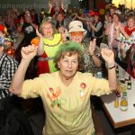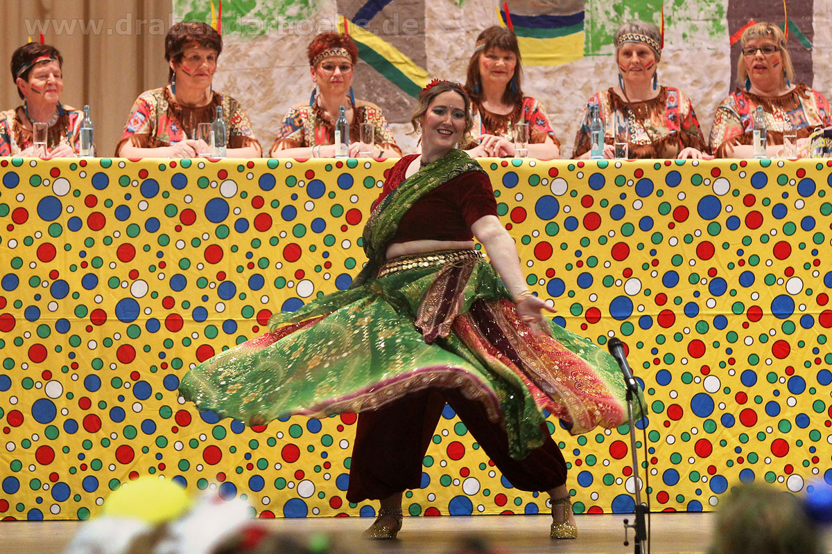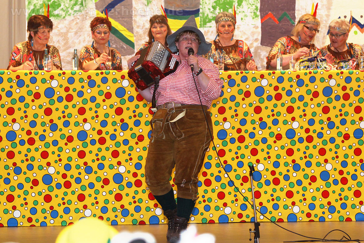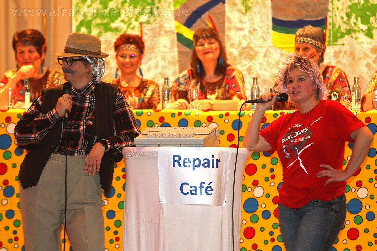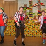 Schlag auf Schlag ging es dann im Kulturhaus unter der Regie der Elferratsvorsitzenden Hannelore Brabender und wie immer, mit Kräften aus eigenen Reihen: Ilse Buchholzer in zünftigen Lederhosen und Sepplhut singt über ein fesches Madl, Silke Lermann zeigte anmutigen Tänze aus dem Orient, die Dorfrocker alias Kathi Buchholzer, Hermine Fuß und Waltraud Orben rücken zur Gaudi aller mit einer Kuhglocke und dem Lied „Dingdong, Klingeling, die Glöcknerin von Dingolfing“ an. Wie es in einem Repair Cafe zugeht demonstrierten in einem Sketch Adelheid Hann und Elke Hihn. Kathi Fink und Ulla Schenker plauderten als Putzfrauen über untreue Ehemänner und Diäten: „Mein Arzt hat gemeint, ich soll mehr Fett verbrennen. Gut, hab ich gesagt. Dann geh ich jetzt nach Hause und schmeiß gleich den Grill an.“