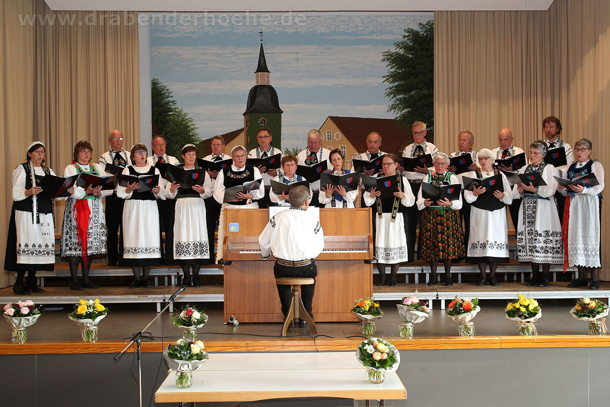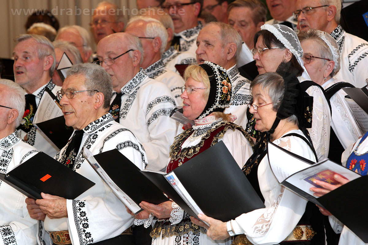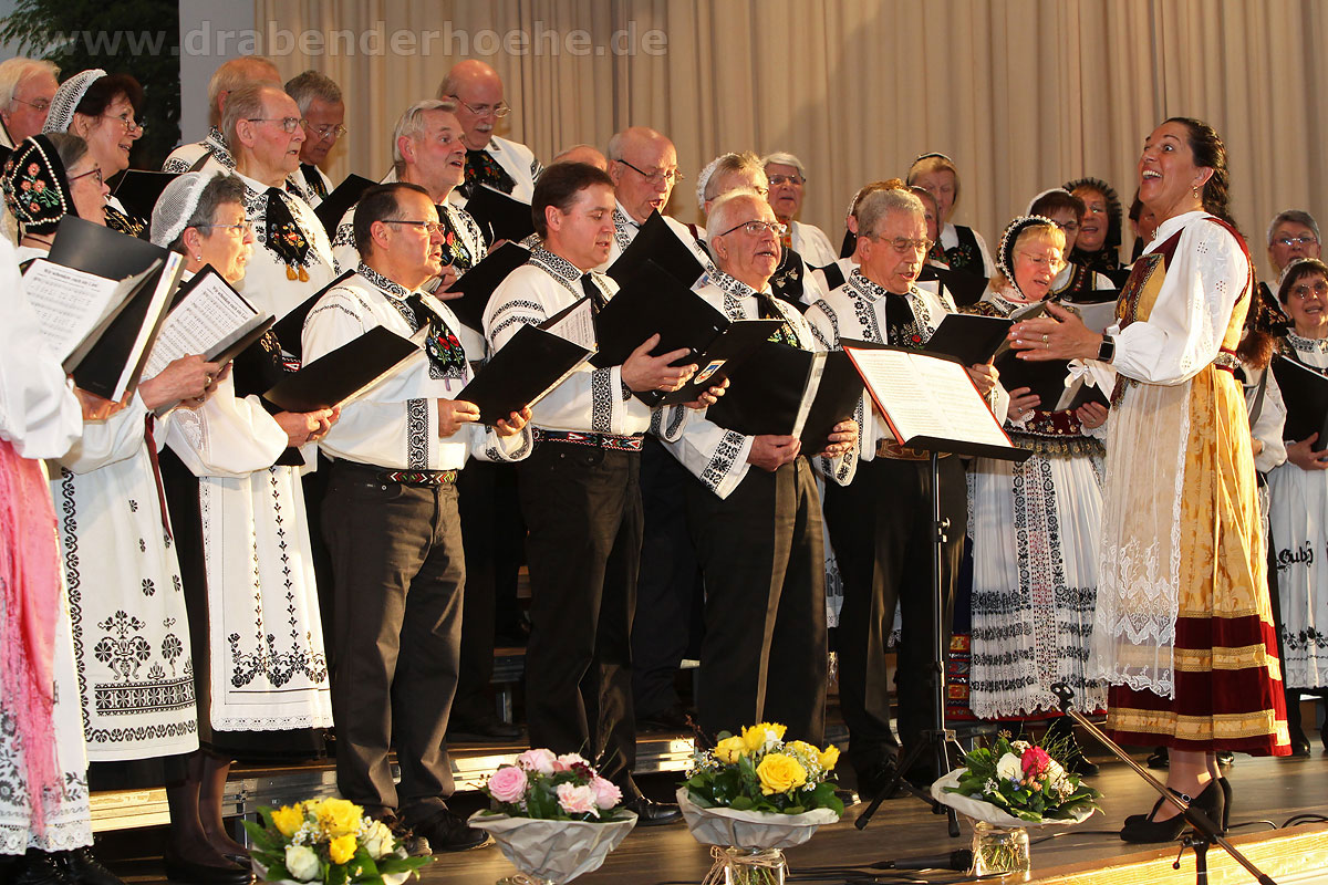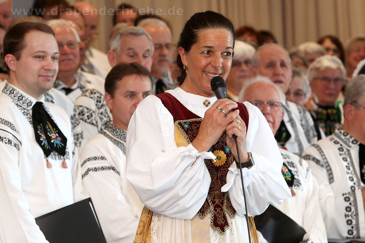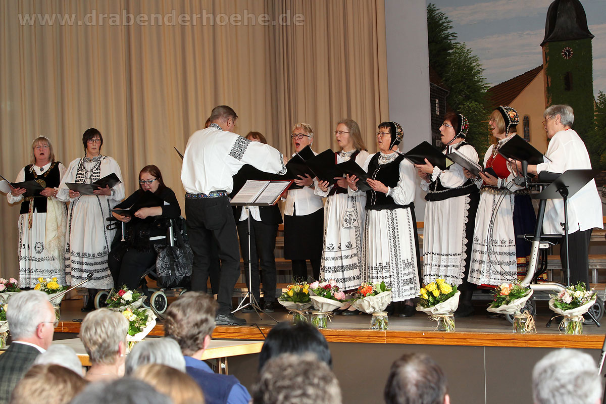 Vorsitzende Anneliese Hüll stellte dann den Honterus-Chor Drabenderhöhe vor, der als Gastgeber für dieses Treffen fungierte und 1966 gegründet wurde. Zurzeit zählt er 43 Sängerinnen und Sänger, die Frühjahrs- und Weihnachtskonzerte geben und eine eigene Theatergruppe besitzen, die jährlich den Katharinenball mit Aufführungen bereichert. Mit „Wir schenken euch ein Lied“ , der Titelmelodie aus dem „Zauber der Musik“ von Bühler und der Farbe des Frühlings aus „Zirkel der Jahreszeiten“ verzauberte der Chor das Publikum.