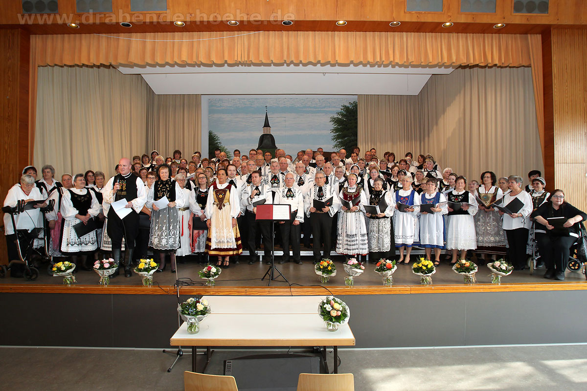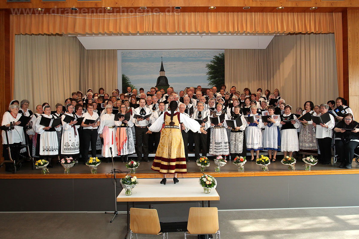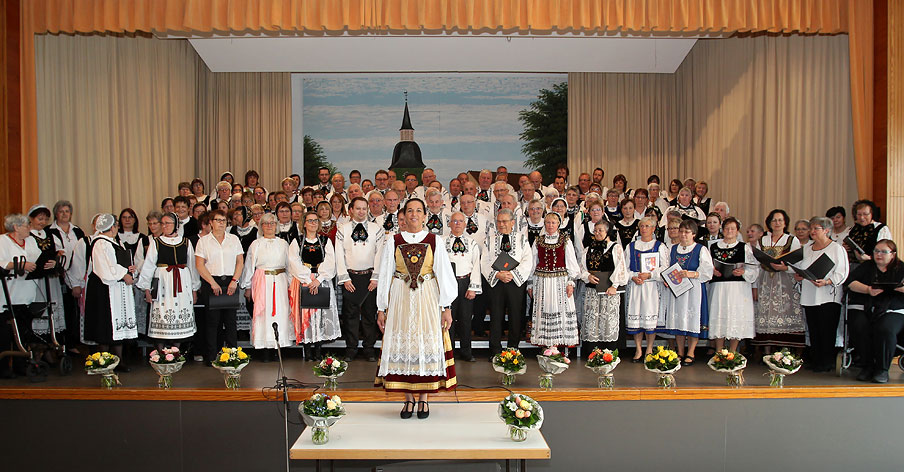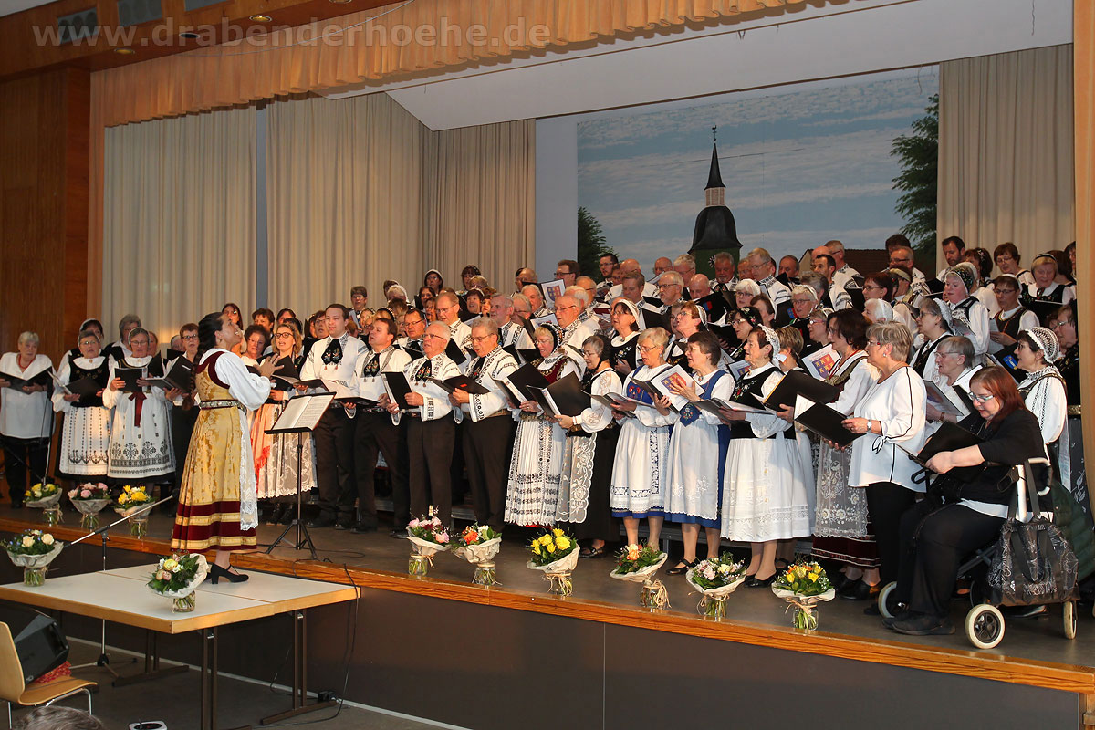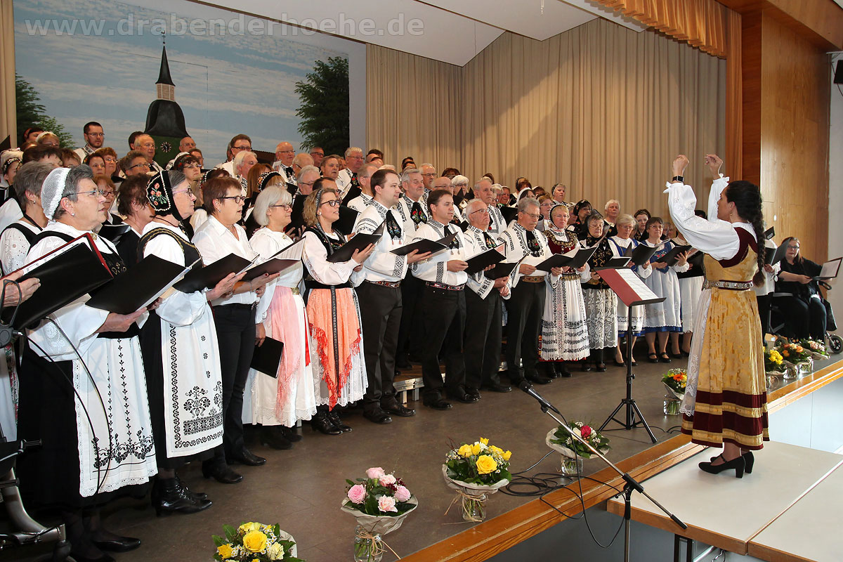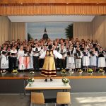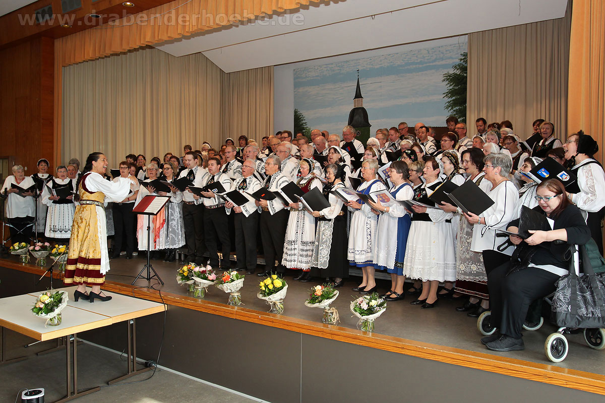 „Zuvor so lasst uns grüßen von Herzen, was von Herzen singt. Ein Band soll uns umschließen…!“ Einfühlsam begrüßten rund 130 Sängerinnen und Sänger mit einem Lied von Werner Gneist, die vielen Gäste, die am 6. April 2019 ins Kulturhaus gekommen waren. Sie erlebten ein eindrucksvolles Treffen von fünf siebenbürgischen Chören aus NRW, die in ihren Trachten ein harmonisches Bild boten. Für Dirigentin Regine Melzer gab es auf der Bühne keinen Platz, sie stand auf einer Empore davor, um den Taktstock zu schwingen.
