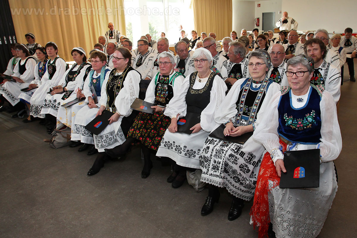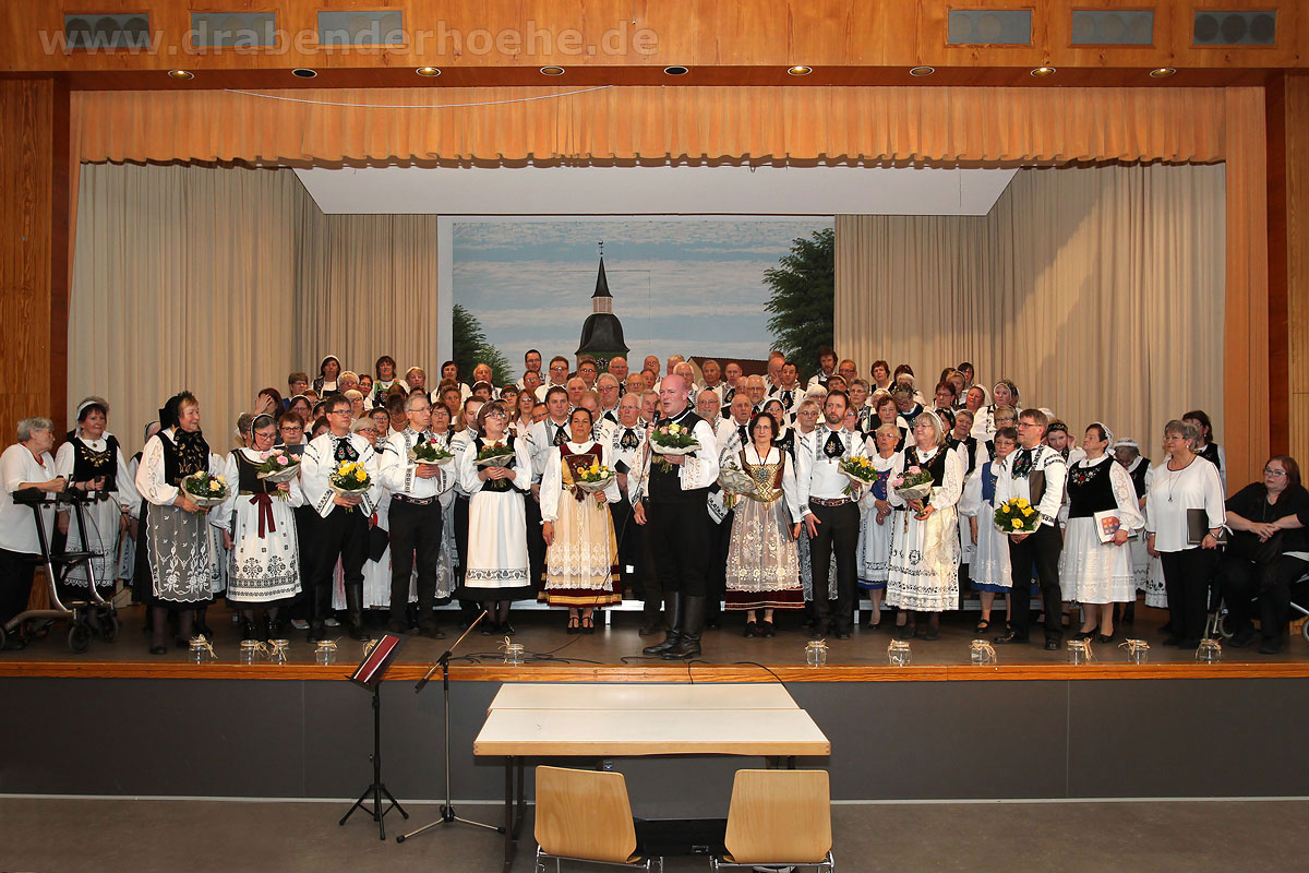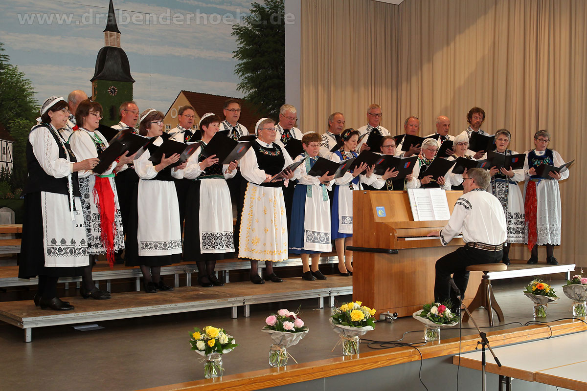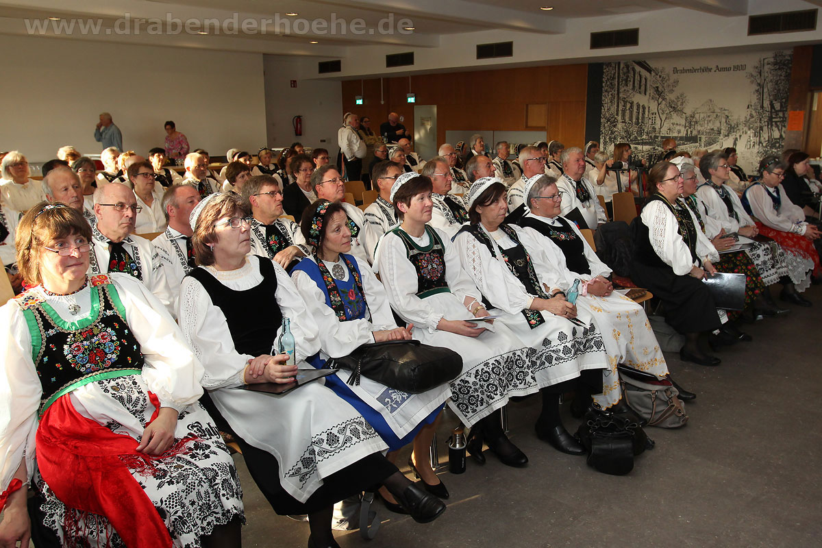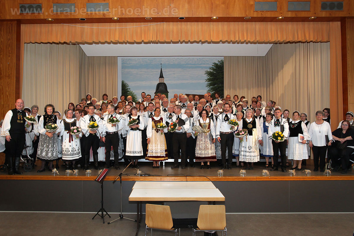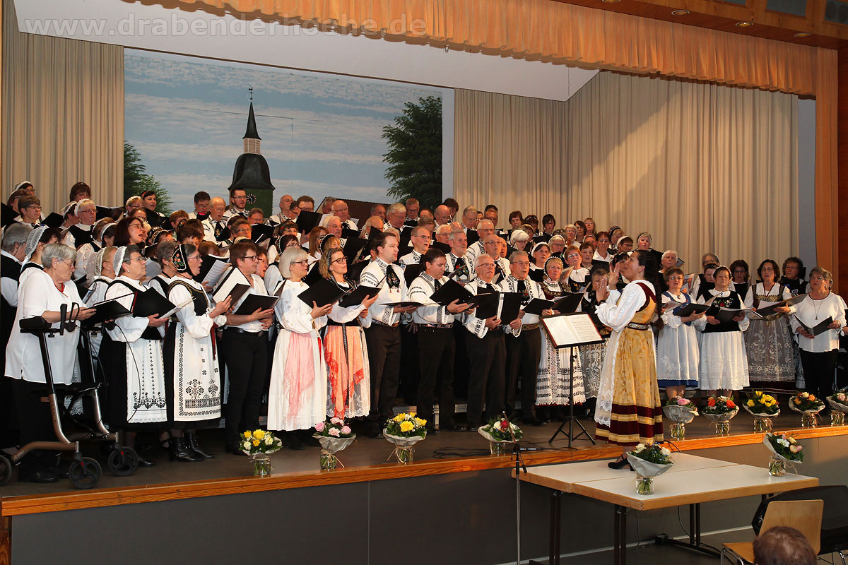 „Zuvor so lasst uns grüßen von Herzen, was von Herzen singt. Ein Band soll uns umschließen…!“ Einfühlsam begrüßten rund 130 Sängerinnen und Sänger mit einem Lied von Werner Gneist, die vielen Gäste, die am 6. April 2019 ins Kulturhaus gekommen waren. Sie erlebten ein eindrucksvolles Treffen von fünf siebenbürgischen Chören aus NRW, die in ihren Trachten ein harmonisches Bild boten. Für Dirigentin Regine Melzer gab es auf der Bühne keinen Platz, sie stand auf einer Empore davor, um den Taktstock zu schwingen.