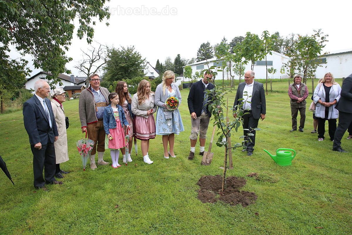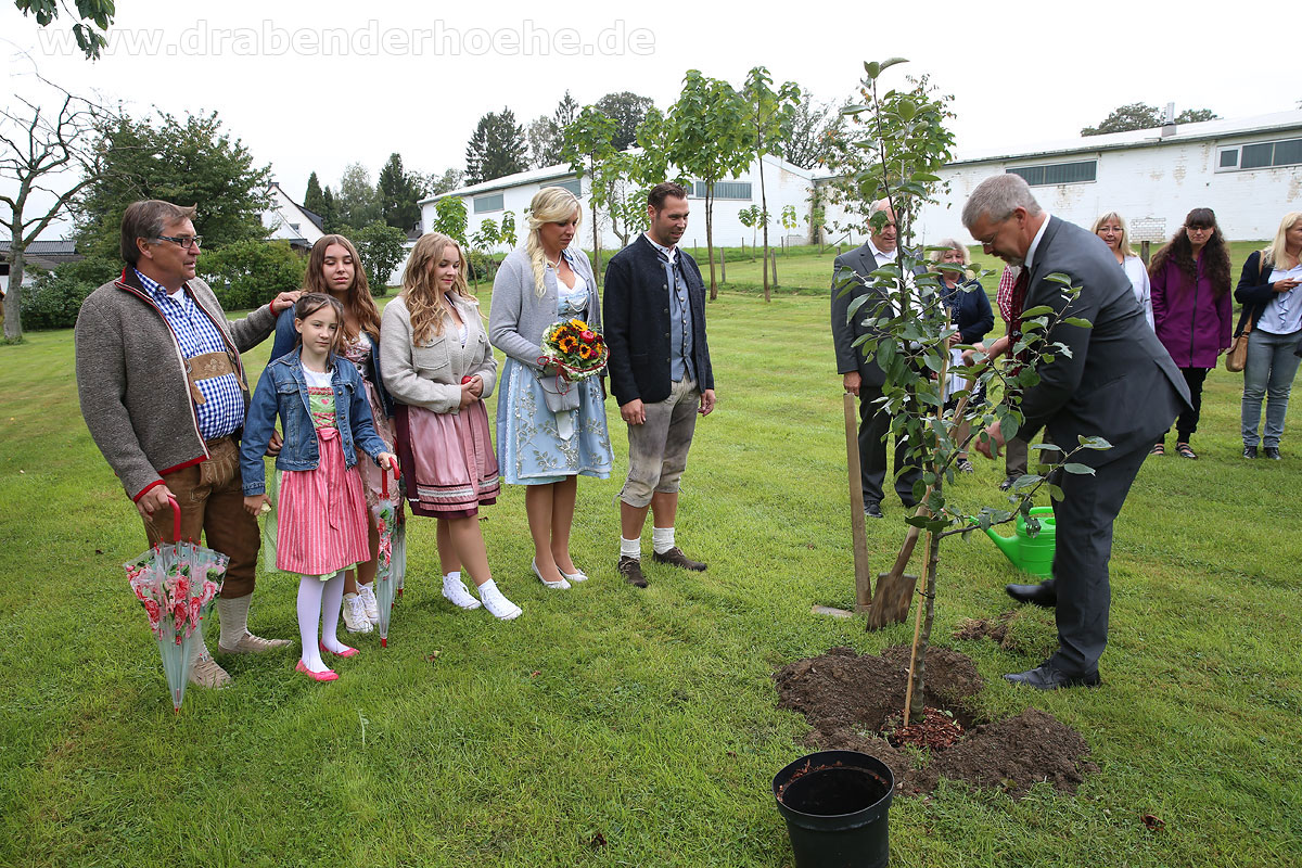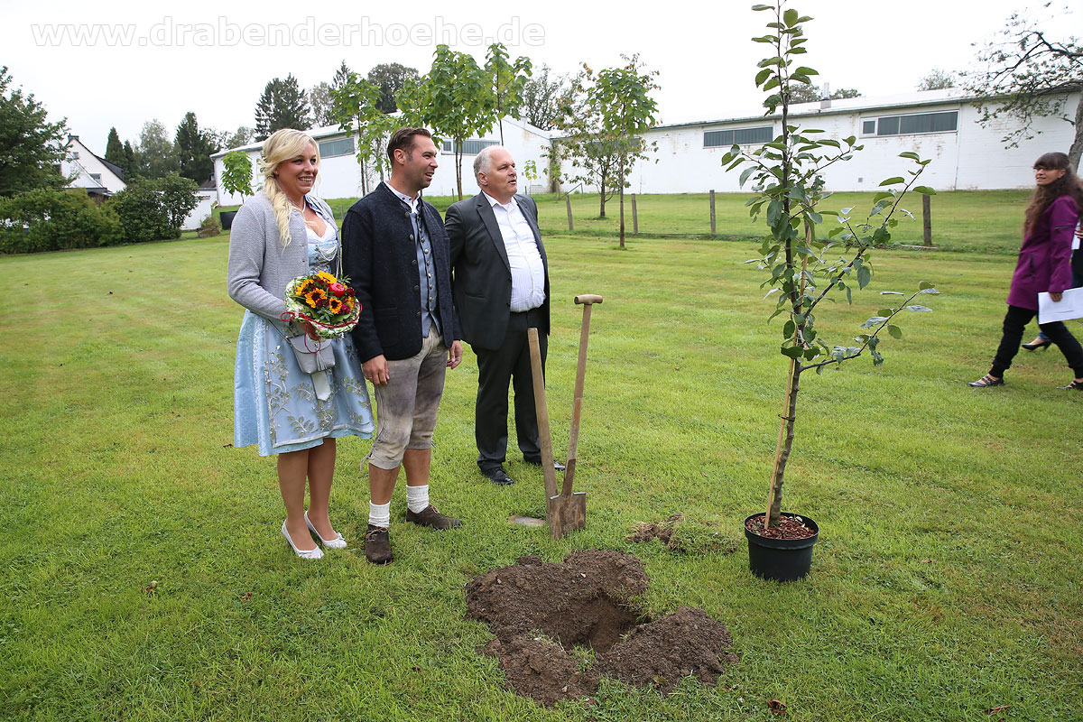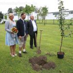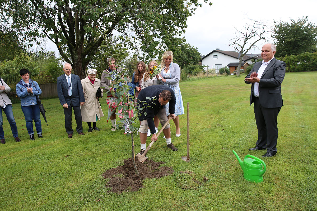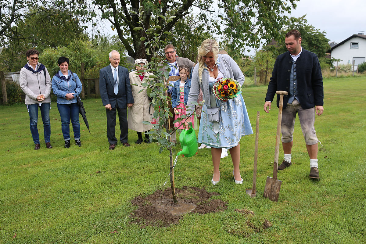 Nach dem Gottesdienst wurden vom Erntepaar Noel Lutter-Denni und André Denni, gemeinsam mit der Gottesdienstgemeinde, auf der Pfarrwiese ein Apfelbaum gepflanzt.