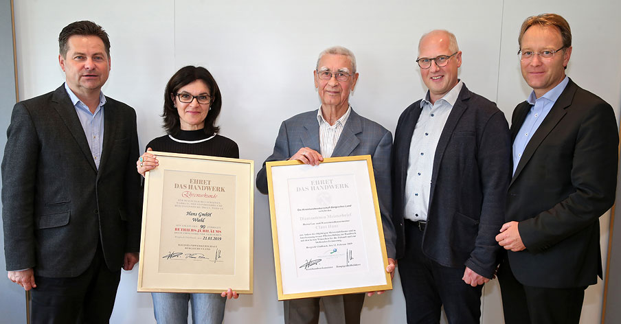 Zum 90-jährigen Jubiläum der Hans GmbH ehrten Bürgermeister Ulrich Stücker und Marcus Otto, Geschäftsführer der Kreishandwerkerschaft Bergisches Land, das Unternehmen in Bomig. Claus Hans, der Senior des Unternehmens, feierte zeitgleich sein 60-jähriges Meisterjubiläum und erhielt den diamantenen Meisterbrief.