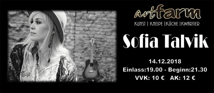 Am Freitag, 14. Dezember 2018, ist die schwedische Sängerin Sofia Talvik in der Artfarm Drabenderhöhe zu Gast. Einlass ist um 19:00 Uhr, Beginn um 21:30 Uhr. Der Eintritt beträgt an der Abendkasse 12 Euro, im Vorverkauf kosten die Tickets 10 Euro.